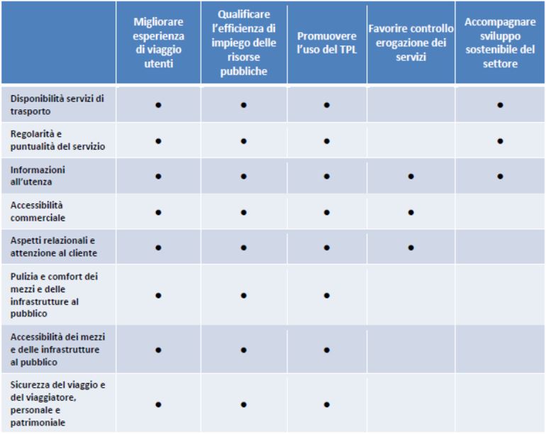 Gli indicatori, i livelli minimi, i sistemi di monitoraggio e le penali vengono differenziati in funzione delle caratteristiche della domanda (prestando attenzione sia agli utenti pendolari, sia all’utenza potenziale) e dell’offerta (c.d. fattori infrastrutturali).
