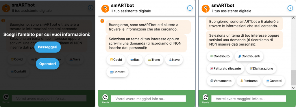 La chatbot, infatti, simula ed elabora conversazioni umane con lo scopo di fornire supporto agli utenti, consentendo agli stessi di interagire con i dispositivi digitali come se stessero comunicando con un operatore reale. Gli utenti possono interagire con «smARTbot», attraverso un percorso guidato per target di utenza, ambiti e argomenti specifici, oppure attraverso l’inserimento di una domanda in linguaggio naturale.