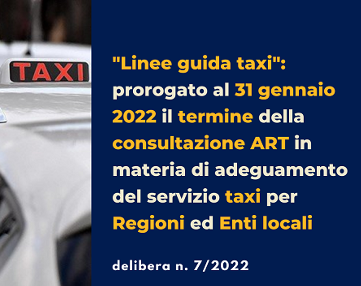 A seguito delle richieste avanzate da più soggetti interessati, l’Autorità ha concesso la proroga del termine della consultazione pubblica sullo schema di atto recante “Linee guida in materia di adeguamento del servizio taxi per Regioni ed Enti locali” indetta con la delibera n. 146/2021.